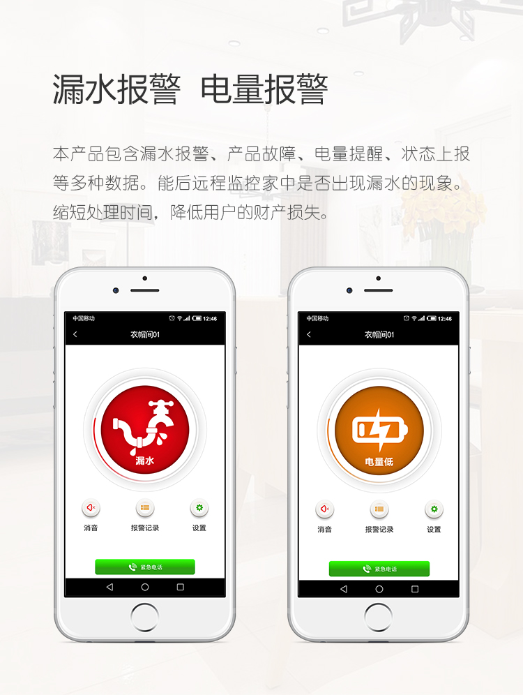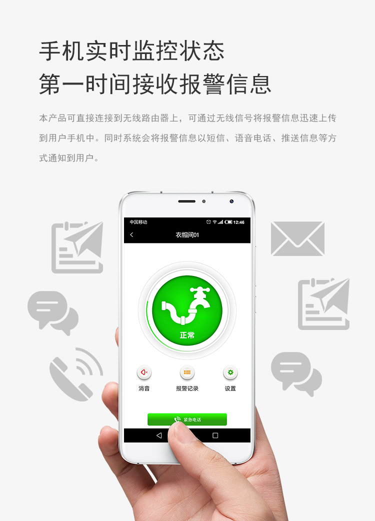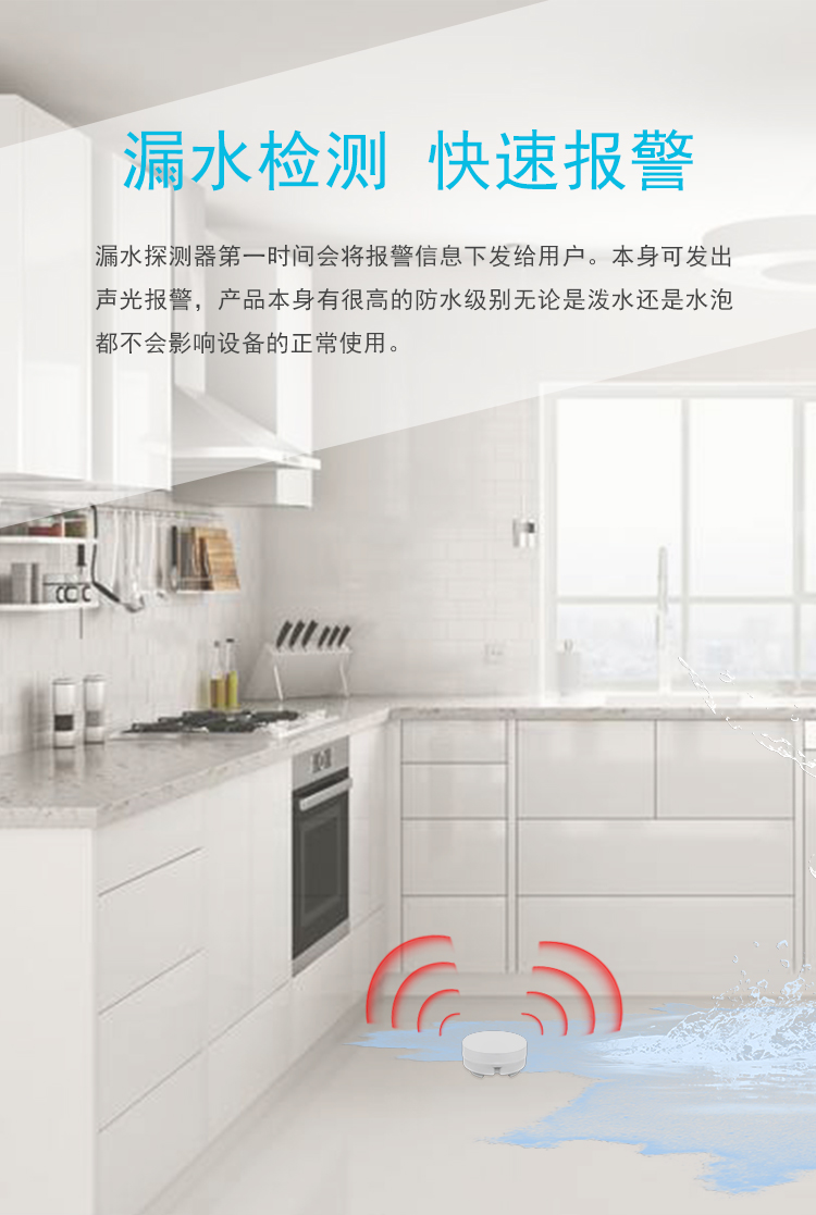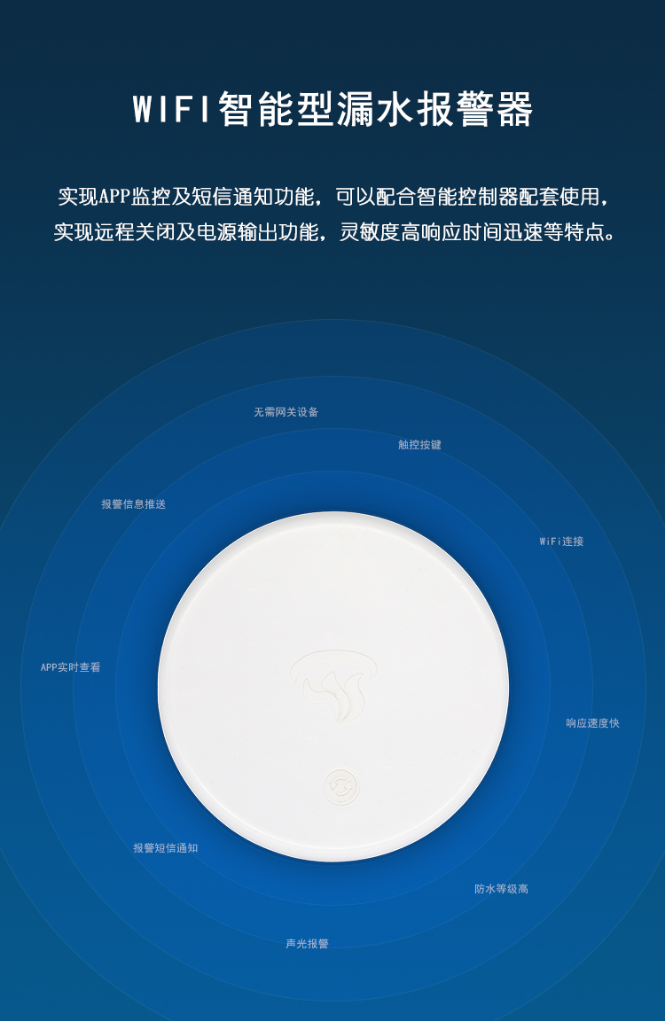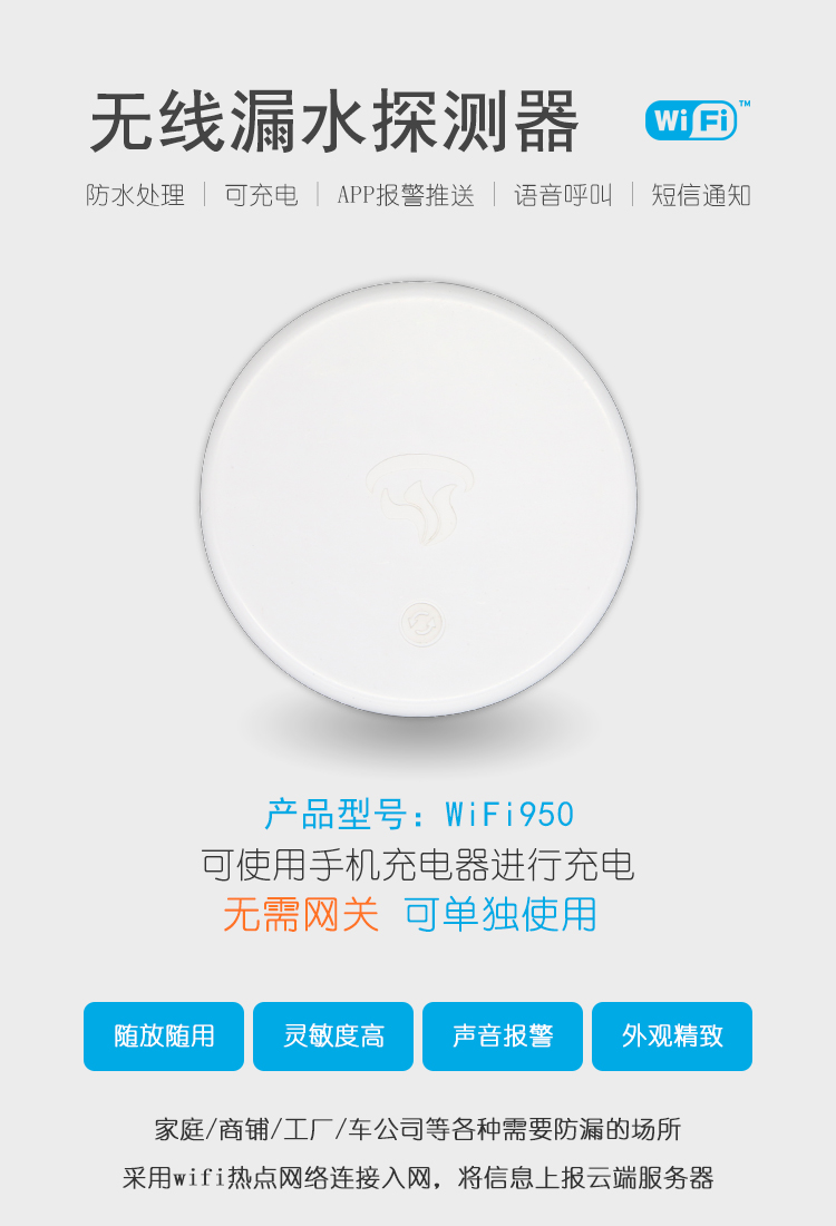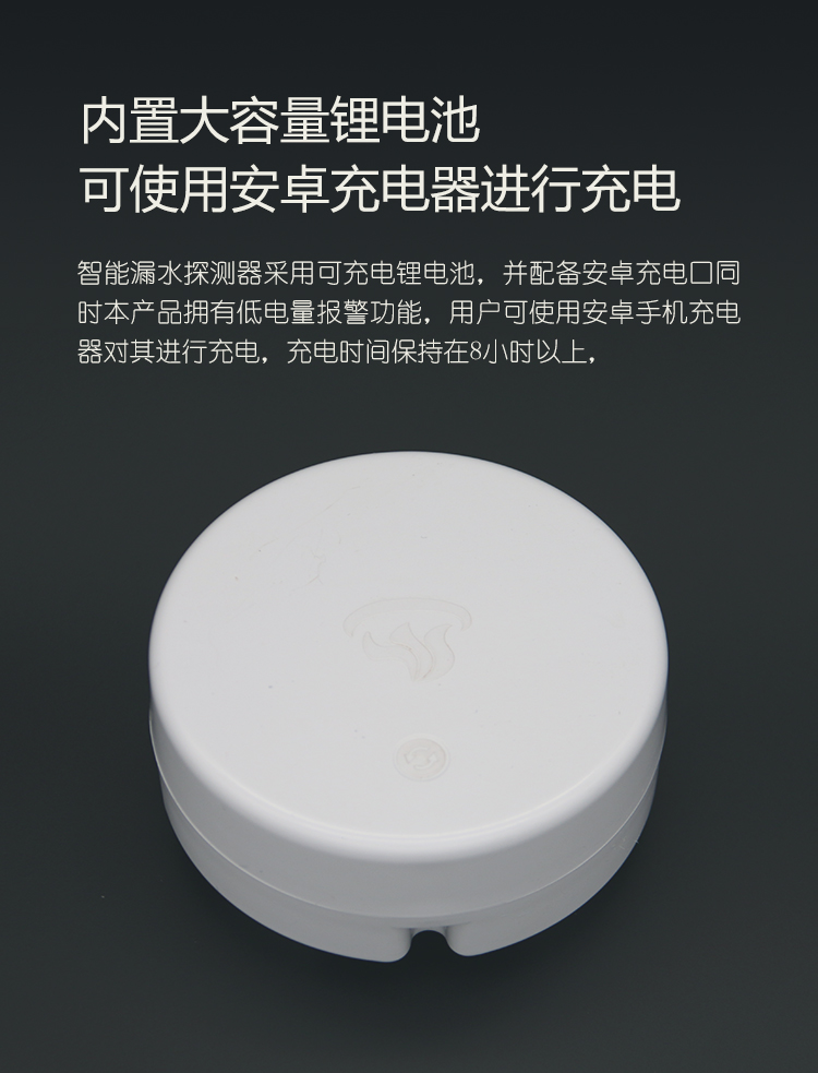 產品描述:本款WIFI型無線漏水探測報警器,防水等級達到IP67,可在5米深水下正常工作。采用家用無線網絡傳輸方式,觸控操作,可充電,可遠程發送報警數據到手機APP,報警信息到手機,語音報警燈功能